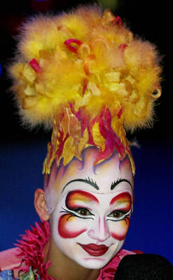 La Belle reflects all human emotion. She is the ever-present town crier who expresses the soul of Saltimbanco. Her language is universal and her song reflects the atmosphere around her. Her vocals are emotions—serenity and excitement, hope and joy, disappointment and melancholy. Graceful in her technicolor dress with waves of sequins, resplendent in her crown of fire like feathers, she sings about the promise of a brighter tomorrow.